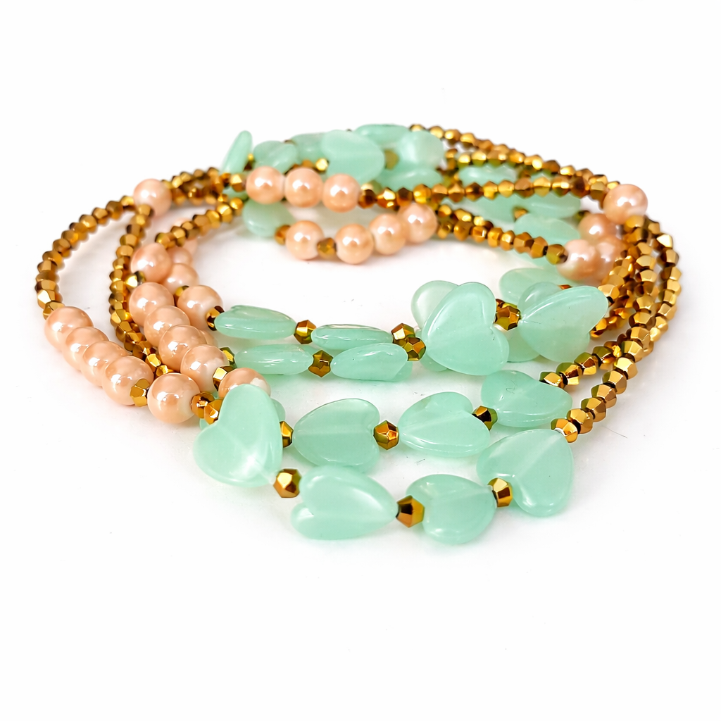 Baya phosphorescent élégant et sensuel, composé de perles vert d’eau lumineuses. Il absorbe la lumière et brille délicatement dans le noir, sublimant les courbes féminines de jour comme de nuit.