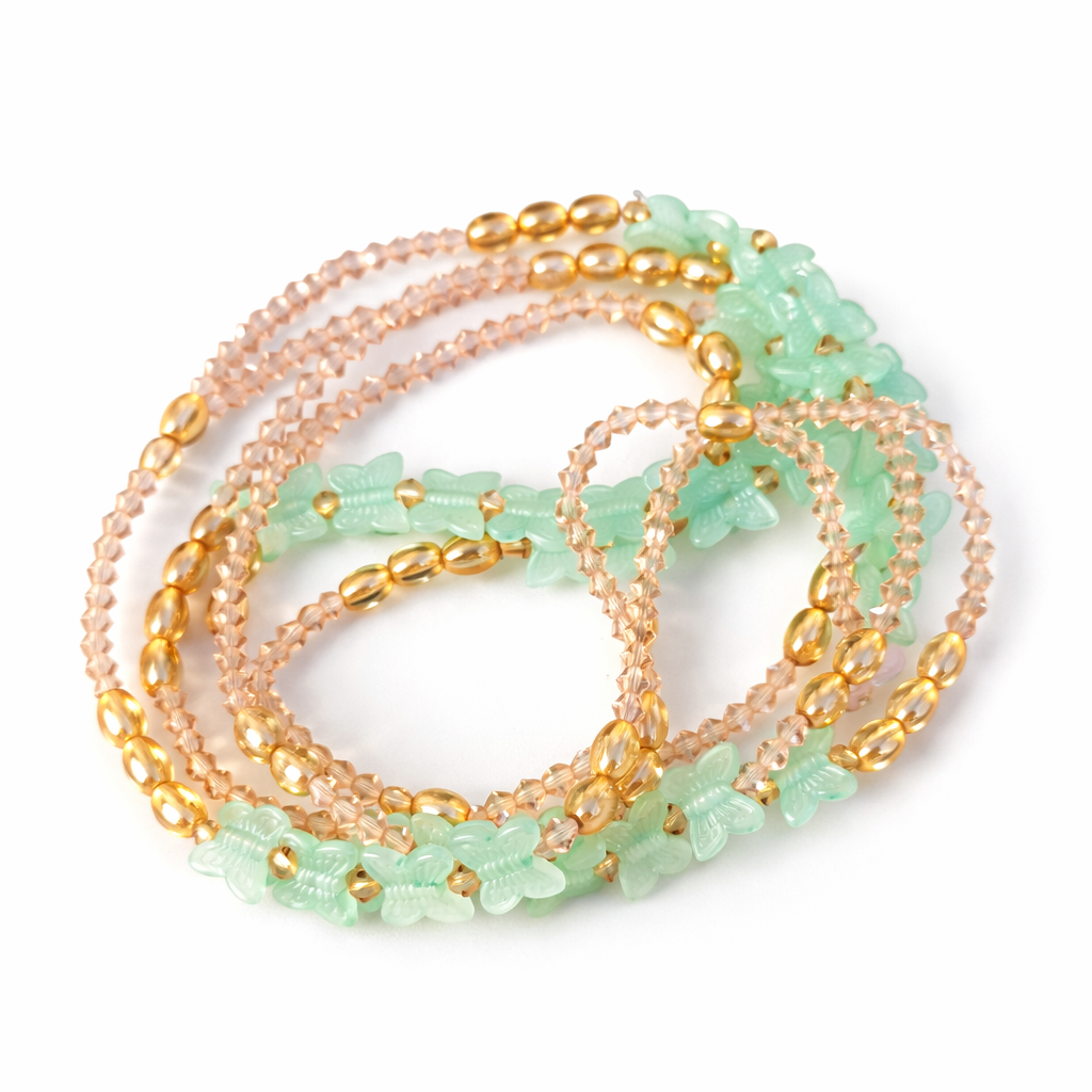 Ce baya est confectionné avec un harmonieux assemblage de perles translucides vert d’eau phosphorescentes, et de perles scintillantes. Exposé à la lumière, il emmagasine l’énergie pour briller délicatement dans l’obscurité, créant un effet à la fois mystique et envoûtant.