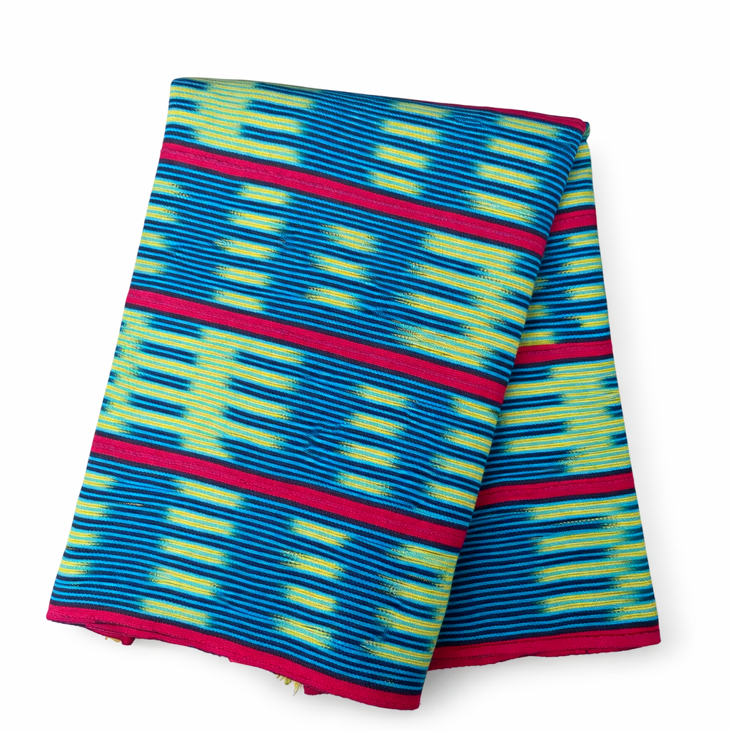 Pagne Baoulé tissé à la main en coton pur, originaire de Côte d’Ivoire. Ce tissu africain artisanal incarne l’authenticité et le savoir-faire traditionnel.