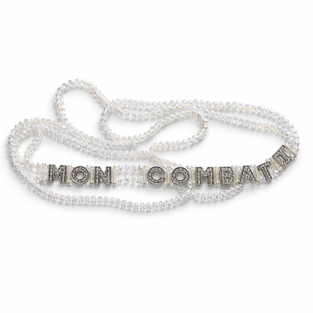 Évitez le contact prolongé avec l’eau, le parfum, les huiles et les produits cosmétiques afin de préserver l’éclat des perles et des lettres.